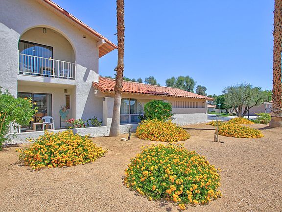 You own the land. Fee Simple condo. Sold Turnkey Furnished per inventory list. Stunning location and views encompass this Two story, end unit, condo with main floor bedroom suite.Another larger suite is upstairs with its own balcony and private bath and dressing area. Multiple patios and one large entry courtyard surround this home. Panoramic mountain views with pool and golf course views just steps away. This very private location feels as if its your own separate oasis with the multiple outdoor patios and views.Soaring ceilings in the great room with with floor to ceiling windows and sliding glass doors leading to the outside. Inside laundry, and two car garage. Space for 2 cars in the driveway too! Sandcastles offers 6 pools, 3 spas, many citrus trees, and its close to Trader Joe's, Target and more.