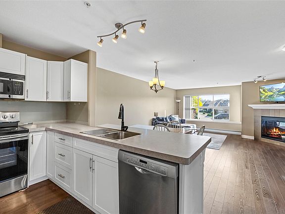 Welcoming white kitchenComplimentary stainless steel appliancesOpen conceptTwo exterior balconies