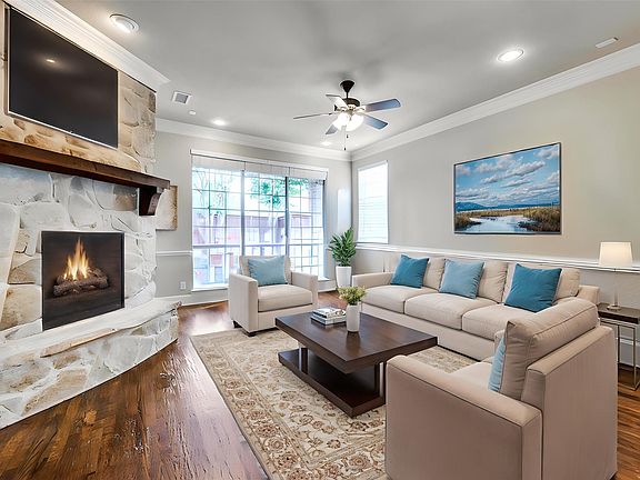 Gas fireplaceModern amenitiesDedicated home officeLush landscaped yardFormal dining roomWet barSpa like bath