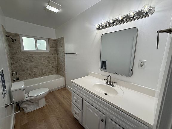 The bathroom features a sleek design with a new sink, new faucet, new cabinets, new bathtub, and hardwood floors. The bedroom offers a spacious closet and large windows with blinds to let in plenty of natural light. An additional closet in the hallway adds extra convenience.