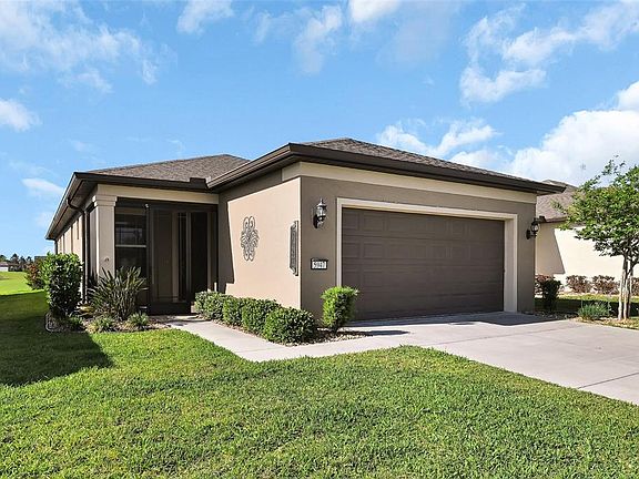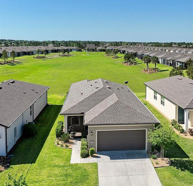 **Price Improvement** Come live a very amenity rich lifestyle in this 2020 built Garden Home in the beautiful golf community of DelWebb Stone Creek! The spectacular open and long range views from this home are hard to find, and even more difficult to pass up! Imagine having your choice of enjoying your morning coffee, an evening cocktail, or even just relaxing with a book while overlooking the peaceful expansive view from your screened lanai or watch the comings and goings of the neighborhood from the quiet privacy of your cozy screened front porch! These two screened areas also allow for refreshing cross breezes through the home, while the handy additional open air paver patio out back is perfect for grilling, stargazing, or simply sitting around a comforting fire pit with hot cocoa on a chilly night. This home is a cook’s dream with a large well designed kitchen consisting of spacious upgraded granite countertops and cabinets, a large center island, upgraded stainless appliances with an LG electric conventional/convection range that also air fries, a well sized reach-in pantry, and a cheerful, bright window above the kitchen sink. The conveniently located indoor laundry room has built-in shelving and boasts a brand new washer and dryer set. The generously sized Primary Bedroom can accommodate larger furnishings and has an attached en-suite bath with private water closet. The large, bright step-in shower and wide solid surface countertops with dual sinks and wood cabinets create a luxurious spa-like atmosphere. The larger walk-in closet provides great storage space for all your clothing and accessories. The much sought-after Guest Bedroom with a very nice walk-in closet is perfectly situated towards the front of the home, next to the Guest Bath, providing optimal guest comfort and privacy. The 2 car garage contains a handy utility sink, an energy efficient 50 gal hybrid water heater, a whole house water softener, and an automatic garage door opener with remotes. The study/office/flex room provides a separate work-from-home space complete with a Cat6 outlet (one of 3 Cat6 outlets spaced throughout the the home), or is perfect for crafts, games, reading, a home gym, or even extra guest space. Relax and enjoy a more leisurely life in this Garden Home, as lawn maintenance, irrigation, weekly trash and recycling pickup, and basic internet are all included within the HOA fees. Enjoy the DelWebb 55+ lifestyle of the Stone Creek community with many amazing amenities including Full Service Health and Fitness/Spa Center, Heated Resort Outdoor Pool and Heated Indoor 25 meter Lap Pool, 5 Tennis Courts, 16 lit Pickleball Courts, 8 Bocce Ball Lanes, Basketball Court, Horseshoe Pits, Community Garden, Dog Park with agility course, Softball Field, numerous Fishing Ponds and miles of walking, biking and golf cart trails. Stone Creek is socially active with a dedicated Lifestyle Director and Spa Director and over 60 clubs and interest groups to join. Stone Creek is located within proximity to golf, shopping, dining, medical services, the World Equestrian Center, local attractions and numerous outdoor activities. Stone Creek also offers a membership optional semi-private golf course, Grille restaurant and an RV storage lot for additional fees. *All room dimensions are approximate; Buyer/Buyer’s Representative to verify*