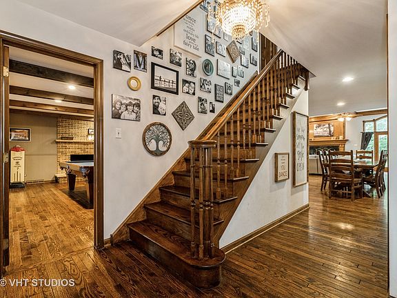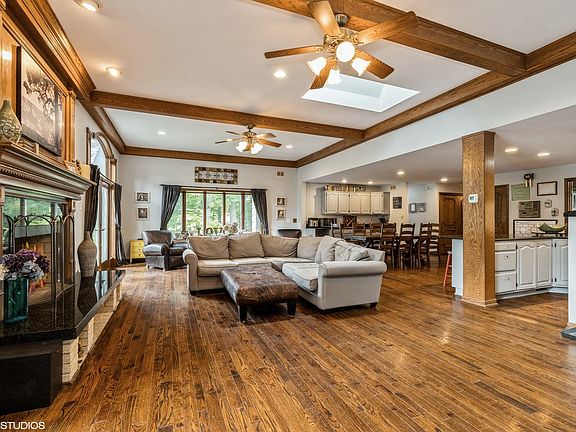 NEED MORE ROOM? - 6 Bed, 4.5 Bath, Wide Open Main Floor with Main Floor Bedroom and Office! Located in Highly Sought After, Frankfort's Prestwick Country Club with Golf Course Views. Enter through the Double Door Main Foyer and you are greeted by Newly Installed Hardwood Floors throughout the Entire Main and 2nd Floor. Framing the Foyer is the Front Staircase (1 of 2), a Large Living Room with Gas Starting Wood Fireplace and Formal Dining Room (currently a Billiard Room) also with a Wood Fireplace, Wood Beamed Ceiling and 2nd Entrance to Kitchen. Move into the OPEN EAT-IN KITCHEN AND FAMILY ROOM SPACE! Featuring New Stainless-Steel Appliances, Granite Counters, Wet Bar, Custom Wood Trimmed Fireplace and Wood Beamed Ceiling. Flanking the Fireplace are 2 Glass French Doors for access to the New, Custom Paver Patio with Built-In Gas Fire Table, overlooking the 3/4 Acre Wooded, Corner Lot! Back inside, off this main space to one side you will find a Mud Room with access to the Attached 3 Car HEATED Garage, Updated Half Bath, 2nd Staircase, Exterior Access and Private Office with Built-Ins. To the opposite end is the Main Floor Bedroom and Full Updated Bath, perfect for a Related Living Set-up. Now up to the 2nd Floor - Spacious Master Suite with Multiple Closets, Changing Room with 2nd Sink and Updated Bath. Additional Bedroom and separate Full Bath completes the Master Wing. Through the Bonus Room, currently a Gaming Room, enter the South Wing with 3 More Generous Sized Bedrooms, Full Bath, Laundry and 2nd Staircase access. Partially Finished Basement. Finishing this Impressive Property is a New Roof and 2 New Water Heaters. Close to Old Plank Trail, Downtown Frankfort, Grocery, Restaurants, Shopping, Transportation and More. Schedule your appointment today!