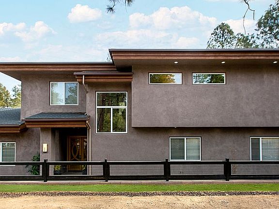 This one-of-a-kind Frank Lloyd Wright inspired architectural 2018 home borders the gorgeous National Forest minutes away from historical downtown Prescott. Clean lines of this large 4 bedrooms, 2 1/2 bathrooms contemporary custom home allows an open floor plan concept. Solid 8-foot walnut Urban doors frame the doorways throughout the home. Kiva Architecture, known for capturing the surrounding natural beauty of the landscape, has once again stood by their reputation keeping the ponderosa pines on the entire property. The interiors were designed by Jeanette Lawler of Jemeyson Interiors. Gorgeous, oversized Chef's style kitchen with Quartz countertops, limestone backsplash, plus a large 8- foot island which doubles as a bar/eat in kitchen is great for entertaining.