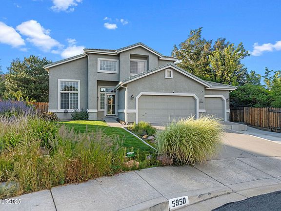 Tucked away on a cul-de-sac with a spacious, private backyard, this stunning two-story home with a three-car garage offers the perfect blend of comfort, and functionality in Northwest Reno. Natural light adorns the space. A cozy fireplace warms the inviting family room, seamlessly connected to the spacious kitchen. Here you'll find beautiful cabinetry, updated stainless steel appliances, stone countertops, a deep farmhouse-style sink, a charming breakfast nook, and split seating at the countertops that is perfect for casual dining or entertaining. Conveniently, a bedroom and full bath are downstairs. The primary suite is a true retreat with a walk-in closet, double sinks, a garden tub, and a separate standing shower. Two additional bedrooms provide ample space for family and guests. Function meets style in the laundry room with built-in cabinetry and shelving. Step outside to a private backyard oasis featuring a paved patio, lush green grass, and endless possibilities. Multiple storage sheds, a designated area for chickens or an enclosed garden, and plenty of room to play make this space truly unique. The property also boasts a creative driveway design with a custom drive-up load-off into the single-car garage. And best of all - no HOA! This home is packed with character and opportunity. Don't wait, schedule your showing today before it's gone! Approximate age of water heater is 6 years, A/C and furnace 5 years, and refrigerator in kitchen 1 year. Naturally Green has checked the irrigation yearly.