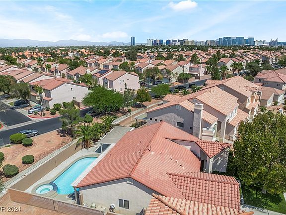 Beautiful well-maintained single-story in gated community of The Estates at Spring Valley. Lush mature landscape in front with serene courtyard area. New AC/Furnace system installed Dec 2022, new Pentair pool filter cartridge system 2023, new pool vacuum 2024, new water heater 2023, new smart garage door opener 2022. Near Town Square, the airport, Allegiant Stadium, and a few minutes to the Strip. Step out from the Primary bedroom to the pool and spa, which has NO REAR NEIGHBORS. The family room leads you to covered patio stretching along the full length of the house with roll-up sun shades. Community park with walking trail. No carpeting, travertine flooring and baseboards throughout living areas, bedrooms have manmade wood flooring. Laundry room has sink hookups/plumbing. Recessed dimmable lighting installed in living/dining rooms. Dimmable spotlights installed on patio. Third bedroom currently using as office with custom built-in cabinets and desks.