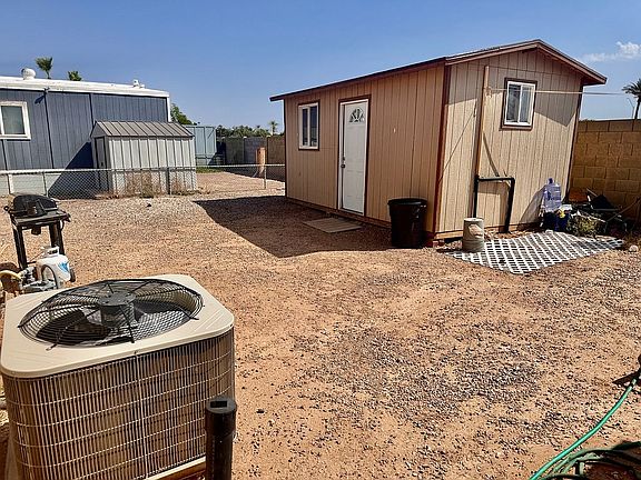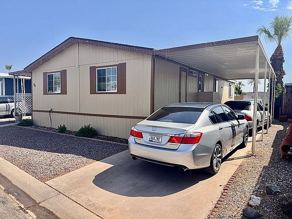 This 5-bedroom, 3-bathroom manufactured home is located in the Villa Vaquero community in Glendale, AZ. The property includes a separate studio with its own entrance and bathroom. The total living space is over 1,600 square feet, including the studio. The main home features an open-concept layout with central air conditioning and heating, in-unit laundry, and kitchen appliances