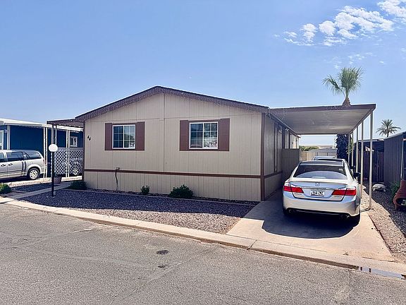 Central AC and heating keep the home comfortable year-round, and the in-unit laundry adds everyday convenience. Kitchen appliances are included, and private parking is available. Located in the Villa Vaquero community in Glendale, AZ, the home sits on a leased lot with a monthly rent of $760.