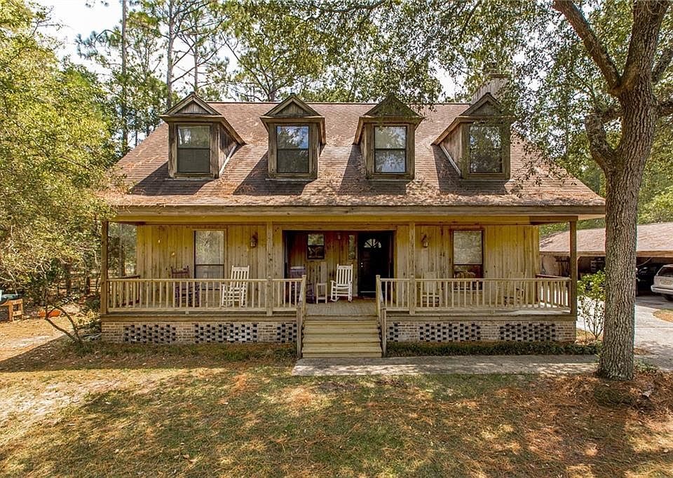 Enjoy country living in the heart of Slidell in this Cajun raised framed cottage situated on 6 acres. You will immediately fall in love with this all-cypress board and batten home which features 2 porches- one in the front of the home and one off the kitchen/dining that overlooks the backyard. Home has an open concept downstairs with wood floors, a dining room, cozy fireplace and ample windows for a warm and homey feel. The primary bedroom and bathroom are downstairs along with an additional bedroom and a half bath. Upstairs has 2 full bathrooms and 5 bedrooms which could easily be used as a family room, play room or office. The 6 acres have beautiful trees including fruit, oak and pine trees with a pond and a 3-car garage with a small workshop and storage shed. This home has been well maintained and loved by the original owners for 41 years