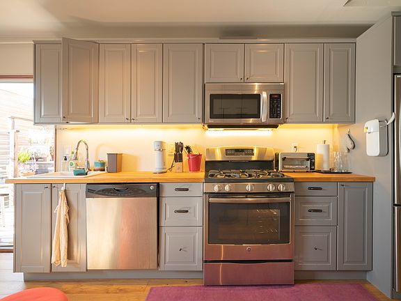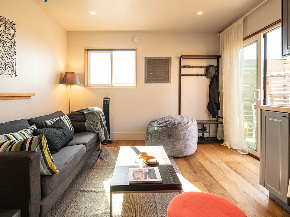 Private attached guesthouse in a beautiful sunny El Cerrito hills. This 1-bedroom is fully equipped with a gas kitchen stove/range, microwave hood, dishwasher, and sink. The open floor plan living and dining area connected to the outdoor deck is perfect for California living. The large 260 sq ft private deck is equipped with an outdoor dining set and a provided umbrella. Surrounded by large trees at nearby Canyon Trail Park (within 3 3-minute walk) and a partial view of a bay.
