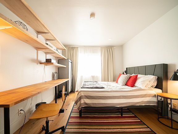 The bedroom has a queen bed with a dedicated worktable and plenty of floating shelves. The modern bathroom has a full-sized washer/dryer conveniently next to it. This is a fully-furnished guesthouse. There are two Daikin split-system wall units for heating and air conditioning.
