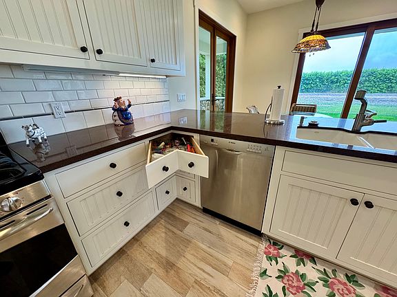 Open-concept kitchenWood-look tile floorsPersonal vegetable gardenStainless steel appliancesLed lightingEasy-close drawersStone countertops