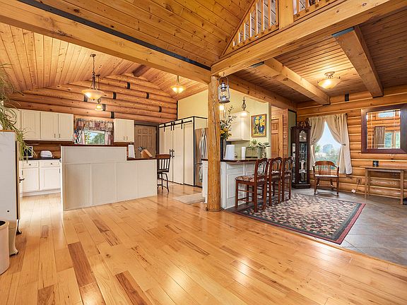 First time ever on the market and pride of ownership shows throughout. This open concept log home offers 3 large bedrooms and 3 full baths. Entire main level is Hickory or tile floors. Excellent workflow space in the kitchen, a large pantry and 2nd prep sink with counter space. Primary suite is 28x28 and also on the main level it features walk-in closet(w/window), huge handicap shower, slider exit to wrap around deck and a laundry room. Walkout doors to wraparound deck also from kitchen and 2 from family room. Loft area has natural light and excellent views. Covered front porch entrance with lots of entry space inside and out. Lower level could be mother-in-law suite or guest quarters with full kitchenette and ample living space. Two more bedrooms and two storage rooms. Plus stair landing area is enclosed storage space with custom made doors. Garage is 32x32, has a heated workshop w/ heavy doors and a 2nd level 12x32 bonus room with 2 dutch doors and a window.