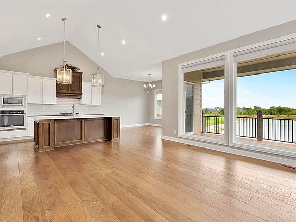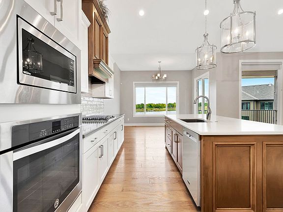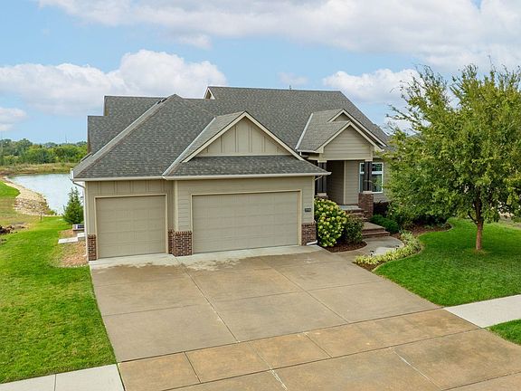 The most desired neighborhood in Bel Aire.This stunning home offers refined living with serene water views. The welcoming entry leads to an open concept living and dining area, enhanced by expansive windows that flood the space with natural light and showcase the peaceful pond setting. The gourmet kitchen is designed for both beauty and function, featuring granite countertops, a large island with eating bar, walk-in pantry, and custom cabinetry. Perfect for gatherings, this space flows seamlessly into the main living area.The owners’ suite is a true retreat with split vanities, a luxurious soaker tub, and a custom walk-in tile shower. A massive walk-in closet with out-of-season rods connects directly to the laundry for convenience.The finished walk-out basement is built for entertainment, offering a spacious rec room with cozy gas fireplace, a stylish wet bar, two additional bedrooms, and a full bath. Step outside with new 900 sq ft limestone patio to enjoy the backyard with direct access to the pond and community green space. Combining elegance, comfort, and an unbeatable location close to shopping, dining, and highways this home is the perfect blend of luxury and everyday living.