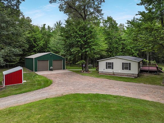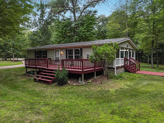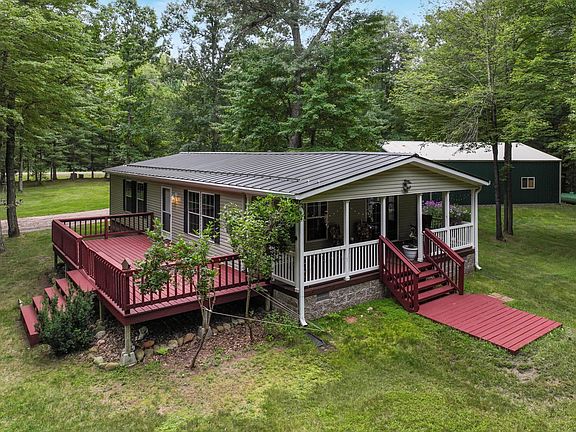 Welcome to your serene retreat! This beautiful one-story home is perfectly situated on a sprawling, level lot just shy of 10 acres, offering the ultimate in privacy and space. The home features expansive living areas that flow seamlessly, making it perfect for both relaxation and entertaining. With two inviting decks, you can enjoy stunning views of your property, whether you're dining outdoors, sipping your morning coffee, or simply soaking in the peace and tranquility. A massive garage offers endless possibilities for car enthusiasts, extra storage, or a workshop, and includes bonus space with a bar for added flexibility. New furnace & central air in 2022! This property is the ideal blend of rural charm and modern convenience—don't miss the opportunity to make it yours!