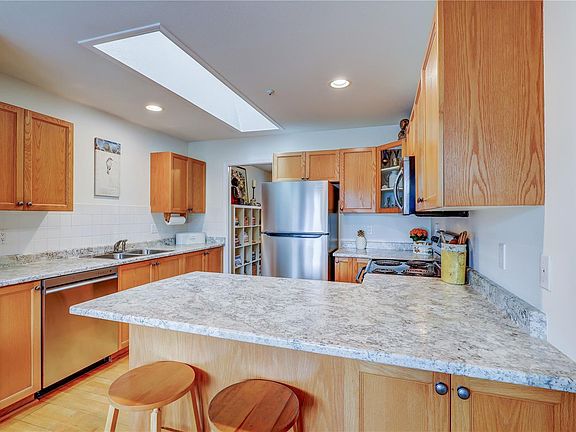 New gas fireplaceUpdated roof with skylightsPrivate patioAmple storage and counterspaceLarge primary bedroomFull ensuiteGenerous second bedroom