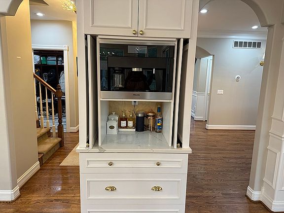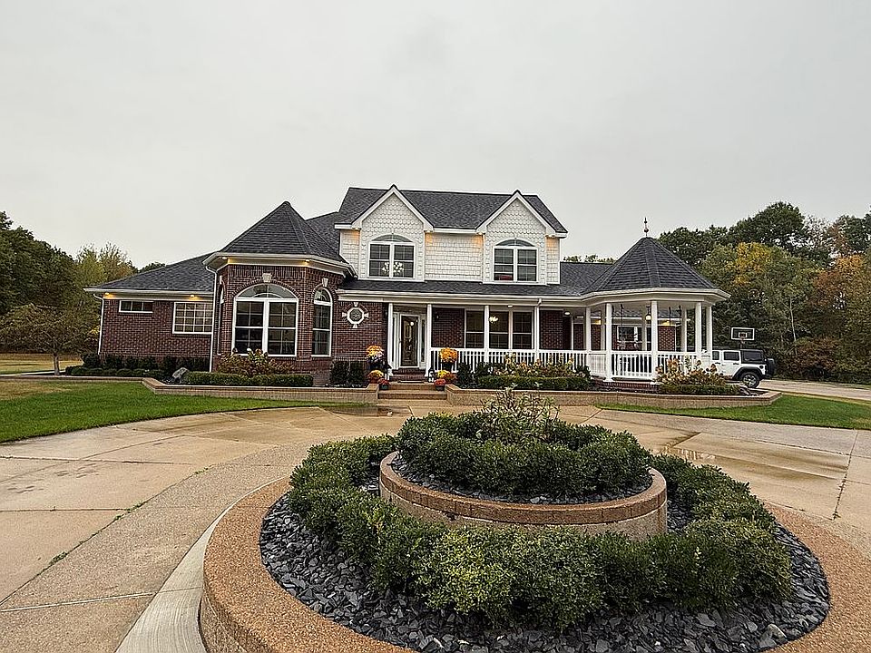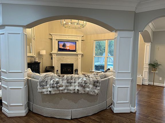 Circle driveCurved stairwayCrown moldingExtensive ceiling detailsMaster suiteOverlooking pondQuartz countertops