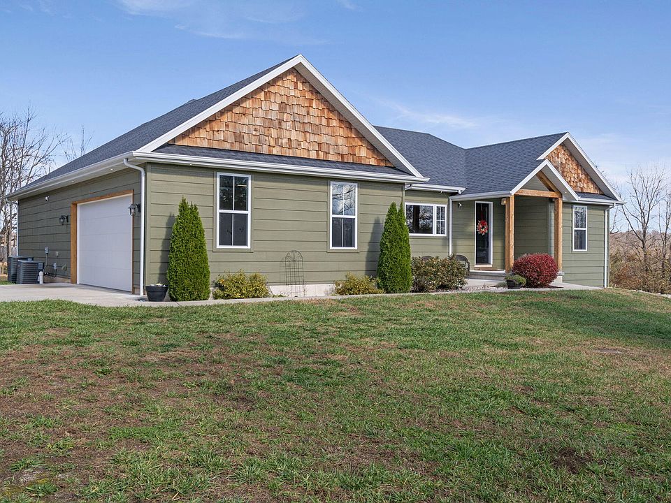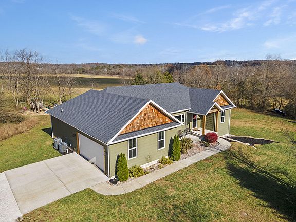 Discover the perfect blend of privacy, quality construction, and scenic living in this beautifully designed 4-bedroom, 3-bath home set on five wooded acres. Enjoy a breathtaking panoramic view from the living and dining areas, showcased through oversized casement windows that bring the outdoors in. Appraisal at time of listing showed value at $634,000.Built with durability and efficiency in mind, the home features 2x6 exterior construction with double-layer insulation, 10-ft ceilings upon entry and throughout the kitchen/dining/living, and 9-ft ceilings in bedrooms and the light-filled walkout basement. The kitchen and bathroom cabinetry are custom-made in Louisiana, adding a warm, handcrafted touch throughout. Upstairs refrigerator stays with home, making this truly turn-key. The lower level offers an additional massive second living area, complete with a large bar that provides ample seating and a convenient wet bar. Perfect for entertaining, hosting gatherings, or creating a separate retreat. Missouri isn't Missouri without storms, here you will find a oversized storm shelter downstairs with built in shelving for plenty of storage. Last but not least is an air conditioned and insulated ''John Deer Room''Thoughtful upgrades include soundproofing behind the washer/dryer and behind the main living room television to keep the adjacent bedroom quiet. Four Wyze security cameras stay with the property for added peace of mind.This is an exceptional opportunity to own a private retreat with high quality finishes and stunning natural surroundings.