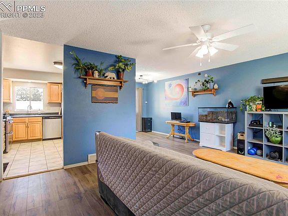 WELCOME HOME! This sweet-as-pie home boasts 4 bedrooms, 3 bathrooms, and a 2-car garage with an abundance of space for entertaining, a flowing floor plan, and is ideally located just minutes from trails, shopping, schools, and more! Entering in from the quiet street, you are greeted with beautiful laminate wood floors that grace the main floor. Unwind in your living room adjoining your dining area with updated fixtures and big windows. Create memories cooking in your kitchen with gas stove, plenty of cabinet/storage space, coffee bar area, and SS appliances. Upstairs, escape your day-to-day in your tranquil master suite complete with en-suite master bath. Two additional bedrooms and a full bath are also conveniently situated on the upper level. Relish watching sunsets from your mountain view windows or from your generous upper deck/balcony with spectacular views of Pikes Peak, Garden of the Gods, and the Front Range. Down a few stairs from the kitchen, you’re welcomed by your 1st sizable family room with striking wood burning stone fireplace. Also on the lower level, you’ll find your separate laundry room with storage space and hangable shelf, and another ½ bath, perfect for when you are cozied up by the fire. Walking out from the family area, you will enjoy entertaining in your fully fenced backyard with expanded concrete patio directly under the upstairs balcony and large storage shed. In the basement you’ll find your wet bar which opens to your 2nd family room area. One additional bedroom and storage/utility area is located off the family room. Additional amenities include: SS appliances, wired 4-camera security system w/ 4k receiver, smart home thermostat, curtains and rods, ceiling fans, workshop with electrical, brick accents, fresh paint, new fencing, custom balcony lighting, updated fixtures, and so much more! Can you imagine yourself living here? This delightful home will go FAST, and you won't want to miss out on this incredible opportunity!