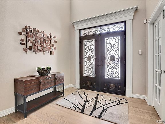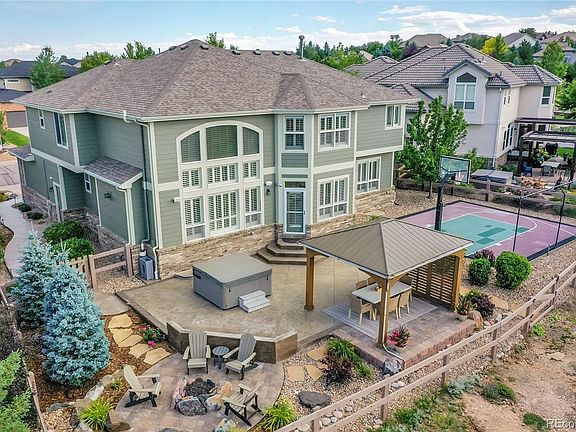 Welcome to your exquisitely appointed contemporary oasis nestled within the prestigious Daniel's Gate area of Castle Pines. This stunning 6-bedroom residence is ideally positioned, boasting an array of luxurious upgrades and thoughtful details. The home backs onto open space, offering breathtaking mountain views, and features a delightful backyard equipped with a sports court, hot tub, and a cozy fire pit—perfect for enjoying Colorado evenings. The main level greets you with a welcoming foyer, seamlessly leading into a spacious living room, formal dining area, and a newly remodeled kitchen adorned with premium stainless steel JennAir appliances, including a gas cooktop stove, double oven, and wine refrigerator, all complemented by sleek white granite countertops and espresso cabinetry. The family room centers around a sophisticated gas fireplace, enhancing the ambiance with its open view to the serene landscape. Ascend to the upper level where four bedrooms await, including a tranquil primary suite with an en-suite bathroom and expansive walk-in closet, with an additional room perfect for a nursery or extra storage. Light chocolate hardwood flooring adds warmth and elegance throughout the main living areas. The lower level extends the living space with two more bedrooms, a full bathroom, a wet bar, and even a kitchenette in one of the bedrooms, ideal for guests or in-law accommodations. Outdoor living is enhanced with a sport court, shaded gazebo for dining, and frequent wildlife sightings. The community's clubhouse and pool provide a vibrant hub for summer activities, while nearby Coyote Park offers pickleball and basketball courts. This home, complete with a central vacuum system and included hot tub, is a private retreat ready for you to call home Showings begin on Friday January 31st.