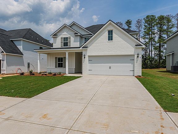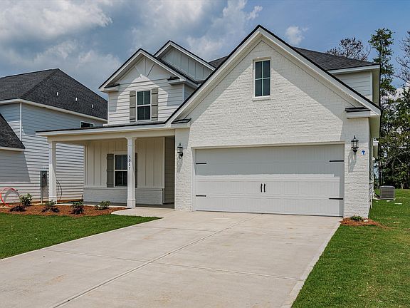 Introducing The Sable Plan, a beautiful 5 bedroom, 3.5 bath home offered by South Georgia Homes. This home is a rare gem, featuring a spacious owner's suite on the main floor. The exterior has incredible curb appeal with board and batten farmhouse accents, a covered front porch, and a covered back porch with a wood-burning fireplace and cedar mantle, perfect for relaxing and entertaining. The home welcomes you with an open two-story foyer and an open floor plan with Evacore flooring throughout the main living area. The large kitchen and great room are perfect for family living, with a kitchen island that includes a farmhouse sink, granite countertops, tile backsplash, pantry, and a dining room with judges panels.