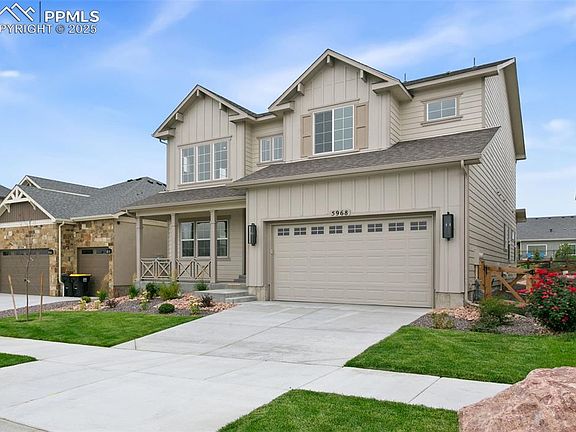 Step into this stunning home located in the highly sought-after Banning Lewis Ranch community—offering resort-style living and endless amenities! Enjoy access to social events, a beautiful clubhouse, multiple swimming pools and splash parks, a dog park, pickleball courts, playgrounds, walking and biking trails, and a state-of-the-art fitness center. Conveniently situated near the Powers Corridor, this home combines modern luxury with an ideal location. Inside, you’ll find beautiful wood laminate floors flowing throughout the main level and a bright, open floor plan perfect for both everyday living and entertaining. The chef’s kitchen is a true showstopper, featuring a large island, double oven, pantry, and ample cabinetry for storage. The adjoining living room offers a cozy gas fireplace, creating a warm and inviting space to unwind. Upstairs, the spacious primary suite includes a luxurious five-piece bath, perfect for relaxing after a long day. The mostly finished basement adds even more living space and features a wet bar complete with a dishwasher and extra cabinet storage and it's own beverage fridge—ideal for hosting friends and family. A small unfinished area provides convenient storage options. Both the front and back yards are fully landscaped, and the covered front porch offers a charming spot to enjoy your morning coffee. With its thoughtful design, modern finishes, and unbeatable community amenities, this move-in-ready home is the perfect blend of comfort, style, and convenience. Don’t miss the chance to make it yours!