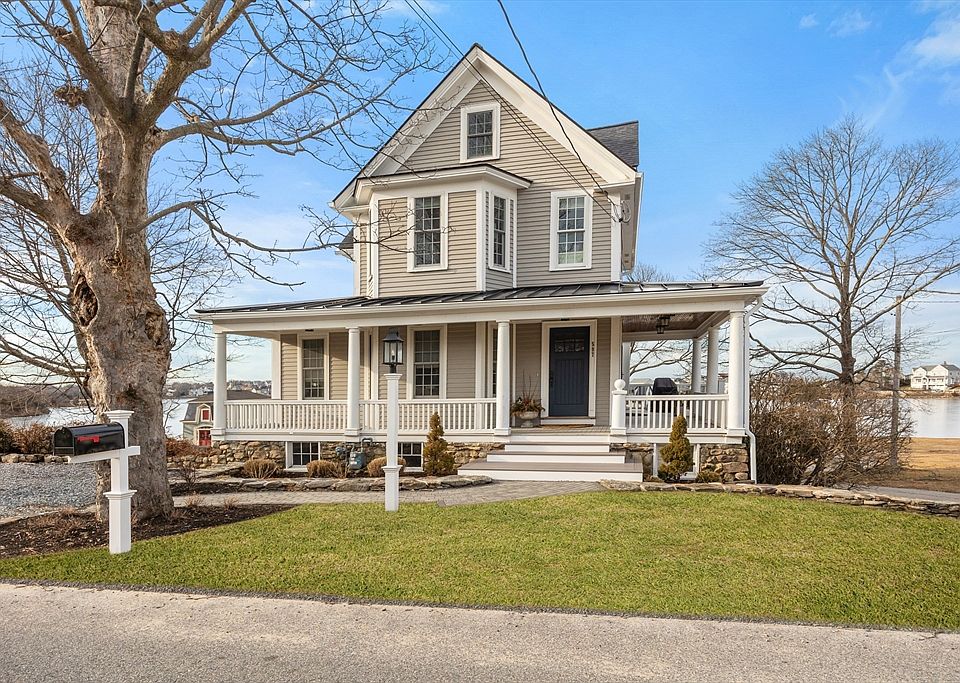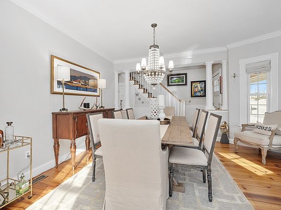 Panoramic views of Straits Pond and the ocean beyond from this CHARMING seaside colonial w/nostalgic wrap around porch on coveted Jerusalem Road. Current owners have only been here for a few yrs, but they made some significant improvements (new roof, new A/C, new windows, kitchen updates, new hardscape/landscape and more!) Enjoy the Chef's kitchen w/large island and sunny dining area, gracious dining room w/built-ins and window seat, but you will love the fabulous Living room off the back of the house w/fireplace and wall of windows to take in the amazing VIEWS. Upstairs there are 3 Bedrooms and 2 full baths inc. a luxurious primary suite. The third floor offers great flex space, currently used as an office and gym. The W/O Lower level flows beautifully to the blue stone patio and lawn space and offers an entertainer's kitchen, family room and guest BR w/bath. Lovely period details throughout this beautiful home, an easy stroll to the Beach and a short drive to the train/boat!