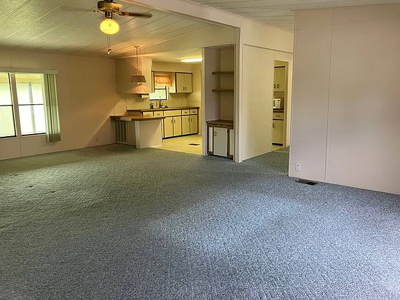 Spacious Layout with Endless Potential! This home has so much potential! Prime location across from the Clubhouse on a corner lot with handicap accessible ramp to the front door and double golf cart parking. Numerous updates : new roof, on demand hot water heater, electrical panel, washer dryer hookup, new flooring in kitchen and entrance, new toilets and sinks in both bathrooms and sprinkler system. The floor plan is amazing! The kitchen has a new double sink and faucet, with an eat in bar. The spacious room open to the kitchen could be a formal dining room and living room. The room open to the kitchen could be a den. The ensuite is large with a walk in closet and large bathroom with double sinks. There are two other rooms that may be made into bedrooms or office space. There is another bathroom adjacent to these two rooms. The possibilities are endless. The laundry room is located off the kitchen. The shed is large enough for plenty of storage.