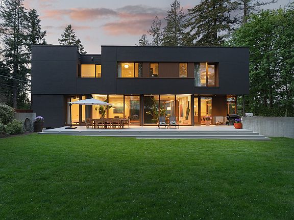 Award winning architectural masterpiece designed by renowned local architect Rick Potestio and built by Don Tankersley Construction. The form is expressed as a series of rectilinear stucco volumes strategically cut away to reveal warmer surfaces of wood and glass. The result is a modern dwelling that is grounded and expansive while deeply connected to its site, landscape, and the life unfolding within it. The private gated estate greets you with beautiful landscaping and a mica stone path leads you to the entrance. Floor-to-ceiling windows flood the home with natural light and frame the lush surroundings. Rich walnut hardwood floors span the first level, while a striking modern staircase of wood, steel, and brass serves as both a functional and sculptural element. The open-concept kitchen is airy and expansive with an oversized island, and sleek stainless steel appliances. double-sided marble fireplace designed by Andee Hess of Osmose Design connects the living and dining rooms, bringing warmth and ambiance.The walls of windows include multiple sliding glass doors that seamlessly opens the interior space to the large outdoor spaces perfect for entertaining. This stunning 5-bedroom residence features a primary suite with a spa-like bathroom complete with Carrera marble heated floors. The upper level hosts a flexible lounging space with a gas fireplace and 3 additional bedrooms featuring custom built-ins and 2 full bathrooms. The lower level has a flexible recreation room with built-ins, a wet bar, laundry room and half bath. The main level has an additional bedroom, full bathroom, mud room and a secondary laundry space. Enjoy the .72 acre fully enclosed private lot, landscaped with multiple areas designed for enjoying the surrounding nature. Located on one of the most desirable streets in the Raleigh Hills neighborhood across from the Portland Golf Club and just minutes to OES, Nike, Jesuit, and downtown. Plus, Washington County taxes.