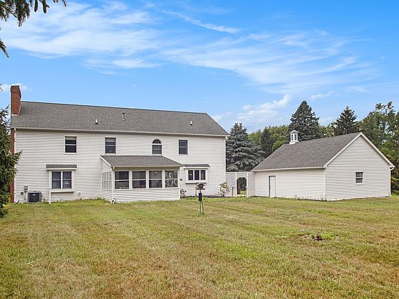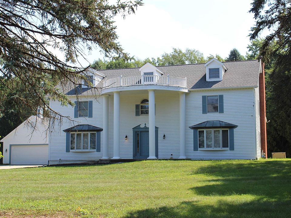 PHM Schools - Classic Colonial 3 bedroom, 2-1/2 bath home situated semi-privately off the road on a partially wooded 4+ acre, tree-lined parcel. Walk in the front door to a grand foyer with beautiful open staircase that leads to a large open loft area suitable for a reading nook, office space, or play area. Upper level split floorplan offers a large master suite with walk-in closet and bath; plus 2 additional large bedrooms and large hall bath. Main floor offers large eat-in kitchen, laundry room with utility sink and storage; half bath, formal dining room and living room. Beautiful hardwood French doors separate the rooms. Family room with fireplace and built-ins. Crown molding throughout the home. Full, unfinished basement with lots of potential. Large detached, 2-car garage with drywall and insulation.