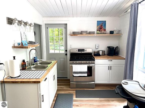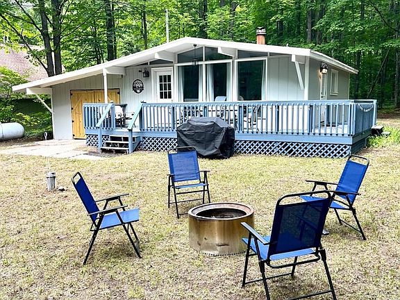 Freshly renovated cottage in Lakes of the North located across the street from Lake Harold Beach! Being sold TURN-KEY! All new flooring, furnishings and paint throughout, new kitchen with butcher block countertops and fresh white cabinets with floating shelves. New shower, vanity and toilet. Living room reno includes built-in feature with electric fireplace and mounted Smart TV, ceiling fan and window treatments. All new cabinets and storage shelf in the laundry/utility room and new custom drive through garage doors. Brand new Mini/Split A/C system installed in July 2023, newer furnace and on demand water heater. The location is perfect with seasonal views of Lake Harold, the snowmobile/ATV trails are just around the corner and the golf course/restaurant and club house just down the road. Clubhouse amenities include indoor pool, lazy river, waterslide and hot tub. There are tennis courts and a winter park located within LON as well! You truly never have to leave this awesome year-round resort community! This cottage also includes an extra lot for a nice pole barn or just privacy. The home has vaulted ceilings making the space feel much larger with an open floor plan. Currently a successful short-term rental, this could be a great family vacation home that can also generate good revenue when not being used. **AGENT OWNED**