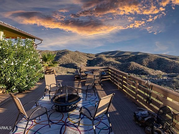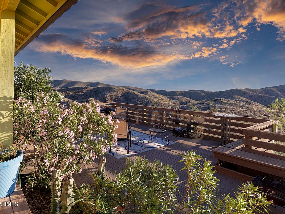 CALLING ALL CATTLE RANCHERS & OUTDOOR ENTHUSIASTS! This is an EXTREMELY RARE OPPORTUNITY TO OWN YOUR OWN PERSONAL PARADISE! Welcome to 5975 Aurora Hills Road, where desert living meets timeless design atop a private mountain at 4300 feet, surrounded by thousands of acres of Bureau of Land Management, overlooking the Wickenburg Valley. This turnkey adobe home with a metal roof offers peaceful seclusion, stunning sunsets, and unbelievable night skies just 1 to 1.5 hours from Phoenix and 20 to 30 minutes from Wickenburg. Built in 2011, the 1,300 sq ft residence features 2 bedrooms, 2 bathrooms, vaulted ceilings, and a sprawling wraparound porch on three sides. The property is fully self-sufficient with a 75 kWh solar system (58 panels, 10 lithium batteries, updated 6/23), propane, 5-ton AC, hot tub, real wood fireplace, water softener, chemical septic. High-speed HughesNet internet, and a new 80-gallon on-demand well pump installed in 12/23. Outside, enjoy a huge patio with 360° views, established trees and shrubs, landscape irrigation, a wildlife water hole, sports court, shed, carport, and a SkyCat Model 163 RV that sleeps 6. Smart features include a remote-control thermostat, camera system, & weather station. Recreation is abundant with hiking, ATV trails, hunting, shooting, gold panning, and easy access to Wickenburg's vibrant shops and events. An additional 36-acre parcel expands the opportunity with two wells, a perking septic system, two gold mines (Texas and Demon), three potential building sites with mountaintop views, a large equipment shed, and a 200-gallon water holding tank ideal for building out a cattle ranch (just add fencing), multi-home compound or private retreat. Tractor, ATV, and UTV are negotiable. Just add fencing for a great cattle ranch. Parcel outlines found in red are rough estimates. Seller financing is available if needed!