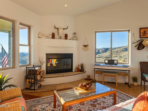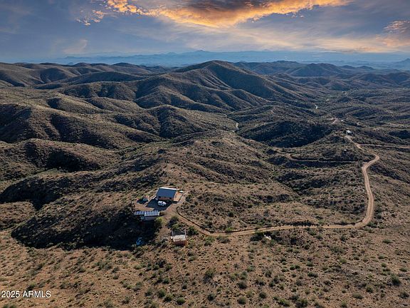 Extremely rare opportunity to own your personal paradise. Welcome to 5975 Aurora Hills Road, where desert living meets timeless design atop a private mountain at 4300 feet, surrounded by thousands of acres of Bureau of Land Management, overlooking the Wickenburg Valley. This turnkey adobe home with a metal roof offers peaceful seclusion, stunning sunsets, and unbelievable night skies just 1 to 1.5 hours from Phoenix and 20 to 30 minutes from Wickenburg. Built in 2011, the 1,300 sq ft residence features 2 bedrooms, 2 bathrooms, vaulted ceilings, and a sprawling wraparound porch on three sides. The property is fully self-sufficient with a 75 kWh solar system (58 panels, 10 lithium batteries, updated 6/23), propane, 5-ton AC, hot tub, real wood fireplace, water softener, chemical septic, high-speed HughesNet internet, and a new 80-gallon on-demand well pump installed in 12/23. Outside, enjoy a huge patio with 360° views, established trees and shrubs, landscape irrigation, a wildlife water hole, sports court, shed, carport, and a SkyCat Model 163 RV that sleeps six. Smart features include a remote-control thermostat, camera system, and weather station. Recreation is abundant with hiking, ATV trails, hunting, shooting, gold panning, and easy access to Wickenburg's vibrant shops and events. An additional 36-acre parcel expands the opportunity with two wells, a perking septic system, two gold mines (Texas and Demon), three potential building sites with mountaintop views, a large equipment shed, and a 200-gallon water holding tank ideal for building out a multi-home compound or private retreat. Tractor, ATV, and UTV are negotiable. Parcel outlines found in red are rough estimates.