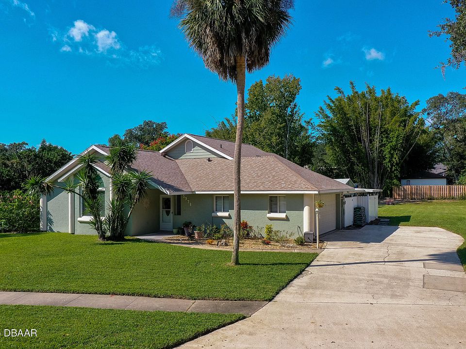 This beautifully maintained home on .5 ACRES features 3-bedrooms, 2-bathrooms just off of Central Park Blvd. Spacious layout, thoughtful updates, and a huge private backyard oasis - all with no HOA restrictions and NO flooding. Recent improvements include a 2023 roof, and impact-resistant windows and patio doors. Adorning the front landscape you'll find a curated butterfly garden, attracting butterflies galore. Step inside to find a welcoming tiled foyer filled with natural light. Soaring vaulted ceilings and a tile-accented wood-burning fireplace anchor the expansive living area, while neutral tones create a relaxing backdrop throughout. The kitchen is both practical and inviting, featuring white cabinetry, generous counter space, a full appliance package, and a pass-through window that connects seamlessly to the living area...Continued... Just off the kitchen, the dining area enjoys peaceful backyard views through sliding glass doors that lead to a screened patio perfect for spotting the hummingbirds and butterflies. The spacious primary suite feels like a private retreat, with a tray ceiling, large window overlooking the backyard, and direct access to a beautifully renovated en-suite bath. The bathroom showcases granite countertops, a double sink vanity, updated cabinetry, and a tiled walk-in shower with mosaic accents and built-in shelving. Two additional bedrooms offer flexibility for guests, family, or a dedicated home office. Step outside to the screened patio that leads to an expansive backyard with lush lawn and a detached storage shed - ideal for tools, hobbies, or recreational gear. Attached covered garden shed and workshop for additional space. A two-car garage and extended driveway provide ample parking, while the freshly painted exterior and sealed stucco deliver lasting curb appeal. Situated in a quiet, established neighborhood with no HOA, there's added flexibility for boats, RVs, or other outdoor needs. Located minutes from the beach, shopping, dining, and the famous Neighbors Ice cream shop, this move-in-ready home offers comfort, flexibility, and a prime Port Orange location. All information recorded in the MLS is intended to be accurate but cannot be guaranteed.