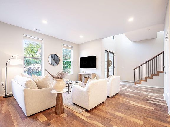 Move right into this breathtaking END UNIT in highly sought after, rarely available, The Townhaus. Located on the edge of German Village with only 10 units designed by Jonathan Barnes. TAX ABATEMENT through 12/31/33! Stunning entryway invites you into the functional Living & Dining rooms w/hardwood flooring, 10ft ceilings, walls of windows and open feel. You will find no wasted space. Chef's Kitchen featuring quartz counters, custom cabinetry, KitchenAid appliances, subway tile backsplash, custom lighting, open shelving & large island. Cozy second floor offers loft/landing perfect for home office filled with natural light, hardwood flooring & 9 ft ceilings. Luxurious vaulted Primary Suite features oversized walk-in closet & en suite bath w/double vanities, walk in shower w/custom tile and top of the line finishes. Vaulted Guest Bedroom w/luxury en suite bath & access to a fantastic 2nd story private Balcony/patio space perfect for entertaining or morning coffee. Second floor laundry with washer/Dryer units in place. Freshly painted interior, nest thermostat & custom blinds. Hard to come by attached 2 CAR GARAGE! Steps to NATIONWIDE CHILDRENS, German Village shops, restaurants, coffee, Schiller Park, Downtown, Columbus Commons, Highway & more! Unbeatable location! HOA fee covers insurance, lawn care, exterior building main., gas, water, trash and snow removal. Virtual Tour-https://youtu.be/krUWFtBEaQI