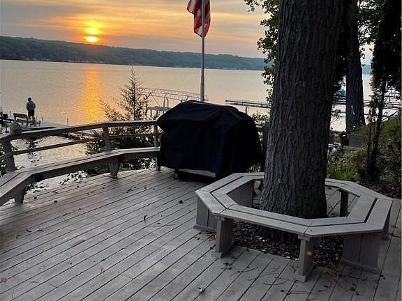 Opportunity knocks. This is your chance to own one of the loveliest year round homes on Conesus Lake. Home located on the water with a lot on other side of the road. Same tax #. Concrete driveway leads to one car garage. Beautiful stone stairway leading to house on the right & outstanding pavilion w/gorgeous stone FP. Sweet deck going across the house with spectacular view of the lake. Interior is meticulously kept. The kitchen has lots of appliances that stay along with most of the furnishings. Kitchens has a generous dry bar to accompany beautiful Woodmode Cabinets. Living room boasts lovely furniture facing another beautiful fireplace. The exterior stone stairway is wedding photo perfect. 102 ft of frontage & has a great dock with a boat, hoist & cover that stay with the sale
