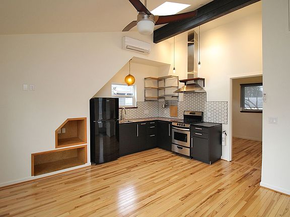 Extra storage spaceAir conditioningPlenty of natural lightHardwood floorsVaulted ceilings with skylightOpen main roomDesigner lighting fixtures
