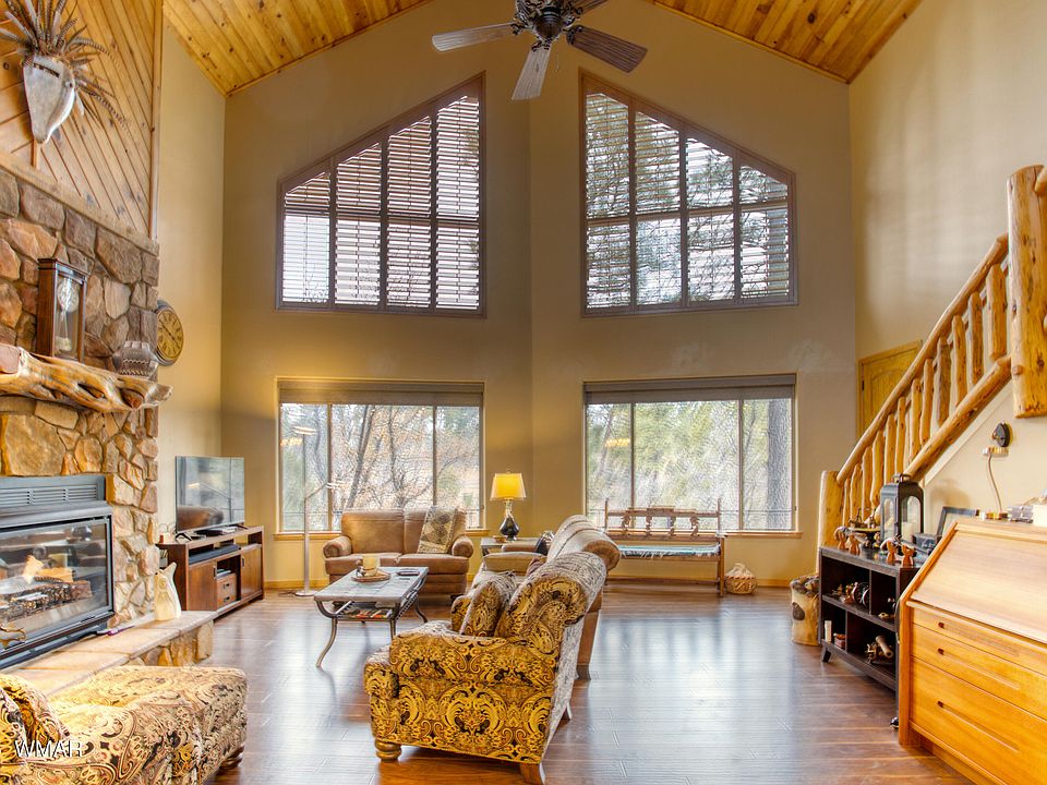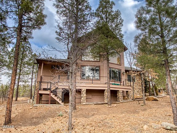 Welcome home!! This beautiful home is centrally located in town and nestled in the desirable, quiet Starlight Ridge subdivision. The beautiful tongue and groove vaulted ceilings and windows highlight the rustic, cabin/chalet design. NEW Custom blinds throughout the home. You'll love the open living space that leads to the kitchen. Cozy up by the fireplace during the winter months by the stone fireplace. Balcony/loft can serve as a great multipurpose space (study, office, playroom etc.) NEW Exterior Paint (10K) New deck railings (20K) This property has a large corner lot across the street from reservation land, PANORAMIC VIEWS, elongated 2 car garage, and neatly landscaped. Location is ideal being close to the hospital, shopping, dining, hiking, and camping. Call today!!