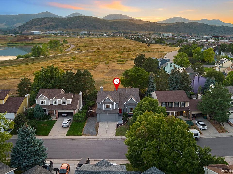 Price Reduced! This beautiful home offers private access to open space, trails, walking & biking paths, & scenic Hine Lake. With no HOA, you can truly make this home your own. Set against a backdrop of breathtaking mountain views, it offers the perfect blend of style, charm, comfort, & outdoor living. Step inside to a warm & inviting living room featuring soaring ceilings, updated flooring, & fresh paint in a neutral palette. The formal dining room offers more flexibility—use it as a dining space, office, or bonus room. For more casual moments, relax in the bright & airy family room with vaulted ceilings, west-facing windows, & a skylight that fills the space with natural light—perfectly framing the open-space landscape. Enjoy watching the sun set over the mountains as you cook & unwind in the remodeled kitchen that showcases quartz countertops, stainless steel appliances, a spacious island, ample modern cabinetry, & dining seating—perfect for entertaining just in time for the holiday season. Upstairs, the expansive primary suite is a private retreat, featuring a luxurious new shower, & wall to wall closets. Two additional upstairs bedrooms are generously sized—one offering its own spectacular mountain views, both which share a full-bathroom. On the main level, head outside to a large lawn with a custom water feature, expansive deck, & firepit with string lights—ideal for barbecues or quiet mornings. Enjoy the serenity of nature, sweeping mountain panoramas, & direct access to open space & lake recreation. This exceptional home offers unmatched comfort, space, charm & convenience in a truly special setting. The finished basement adds valuable flexibility with additional bedrooms, den, full bath, laundry room, & a spacious bonus room—ideal for guests, a home office, gym, or media room. This is a rare opportunity—with no HOA-to own a piece of Colorado’s outdoor lifestyle, all in close proximity to Red Rocks, schools, shopping, golf courses, dining, & C-470.