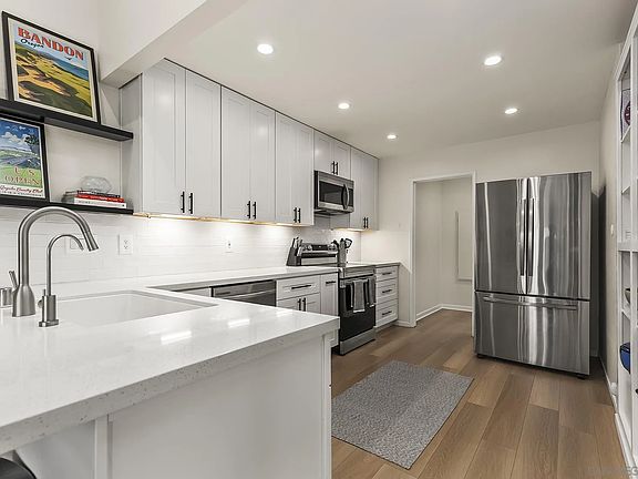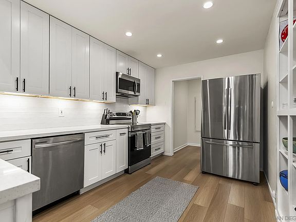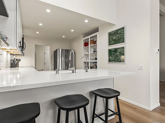 Welcome to 5985 Cirrus Street — a fully renovated 2-bed, 2.5-bath townhome in a prime San Diego location, offering 1,160 sq ft of modern comfort and a rare reverse floorplan. Upstairs, enjoy a bright open layout with new luxury vinyl plank flooring, fresh Swiss Coffee paint, and an updated fireplace. The completely remodeled kitchen features soft-close shaker cabinets, quartz countertops, tile backsplash, under-cabinet lighting, new stainless steel appliances, and recessed lighting. A stylishly updated half bath completes the upper level. Downstairs, the primary suite offers a spacious retreat with a newly tiled shower and tub, modern fixtures, and recessed lighting. The second bedroom is just steps from another full updated bath—perfect for guests or a home office. Both bedrooms include new ceiling fans with lights and cellular blinds. Other upgrades include brand-new dual-pane windows and sliding glass door, a smart thermostat, updated plumbing fixtures, and an attached 1-car garage. The HOA recently painted the exterior of the entire complex. Located near USD, Mission Valley, Old Town, beaches, and major freeways, this move-in ready home offers style, function, and convenience in one of San Diego’s most desirable areas. Don’t miss your chance to own one of the most upgraded homes in the community!null