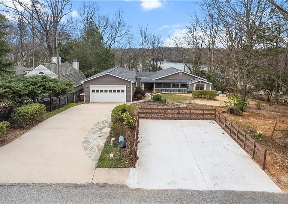 Immerse yourself in the enchanting lake life at this South Lake Lanier haven. Discover a cozy 3-bedroom, 2-bath cottage with year-round water views and a deep water dock. Imagine easygoing days by the lake, parking your boat at your cozy retreat, surrounded by a charming landscaped yard, inviting outdoor spaces, and breathtaking sunsets. This home is a paradise for gardeners, featuring lovely plantings, stone patios, a garden shed, and a rainwater cistern. Inside, an open-concept living and kitchen area with a gas log fireplace offers a perfect view of the water. Glass doors lead to a deck with cable railing and a grilling area. The main level includes two bedrooms and a full bath, while the lower level is a dreamy primary suite with amazing lake views, a sitting area, fireplace, screened porch with a hot tub, and an updated bathroom. A 940 sqft detached garage with room for 4 cars and a temperature controlled workshop adds practical luxury. A short stroll takes you to the single-slip boathouse with lift and platform dock, equipped with OttoDock for easy adjustments. Conveniently located just minutes away from waterfront restaurants, marinas, and the lively atmosphere of Margaritaville – everything you need for lakeside enjoyment is within easy reach.