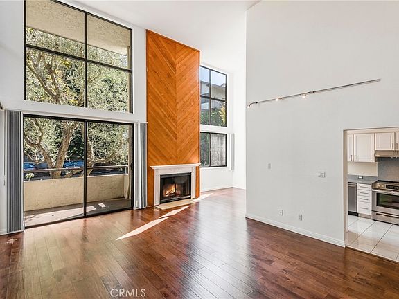 This two-story townhome-like end unit features two bedrooms, 2 bathrooms. Spacious light-filled living room and dining room with soaring ceilings, fireplace, patio off living room. Hardwood floors, carpeting. The kitchen includes a stainless steel refrigerator and stove/range, generous cabinet storage. The first floor has one bedroom with double closets; 3/4 bathroom. The top level features a loft bedroom, large walk-in closet, full bathroom, and laundry closet with washer/dryer. Home features an energy efficient Daikin unit - for cooling & heating comfort. Subterranean tandem parking for 2 cars. Storage cabinet is located in the community closet. Located in the "heart of the Peninsula", this Peacock Ridge complex is located at the end of the cul-de-sac. Common area entry, a heated pool and spa. Ideal, convenient location near Peninsula Center, shopping, restaurants, schools.