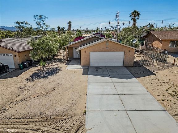 Built in 2006, this single-story home offers 3 bedrooms and 2 bathrooms across a thoughtfully designed 1,222 square feet. The paved entryway leads to a covered front porch, perfect for relaxing outdoors with views of the surrounding mountains. Step inside to a spacious family room enhanced by vaulted ceilings that create a bright, open atmosphere. The seamless flow between the family room, kitchen, and dining area ensures effortless entertaining and family gatherings. The kitchen features modern convenience and ample counter space. The home's layout includes a central hallway leading to three well-sized bedrooms, including a primary suite with a private ensuite bathroom. An under-roof concrete patio extends from the kitchen, offering a sheltered space for outdoor enjoyment. Set on a .15-acre lot, this property provides a blank canvas for your landscaping and outdoor living ideas. The exterior is completed by a 2-car garage with an extended concrete driveway, providing ample parking and storage space. Conveniently located near 29 Palms Marine Base, Joshua Tree, Yucca Valley, Pioneer Town, and countless outdoor adventure opportunities in the local deserts.