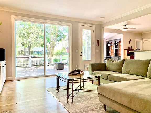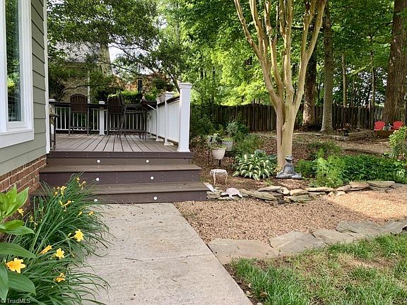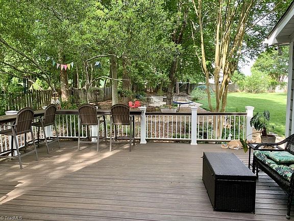 Beautiful family home on large fenced lot in Stoney Creek. Enjoy views of the 8th hole from your Trex deck or stone patio surrounded by flowering trees and gardens. This home features many modern updates. Enjoy a large primary suite with walk-in closets, jet tub, and tray ceiling. Jack-and-Jill bedrooms upstairs, plus bonus room and office. Guest suite with attached bath downstairs. Whitsett offers the perfect mix of suburb and country, with the convenience of groceries and restaurants from Golf House Road and quaint farms exiting Gantwood, including a walkable farm stand. The neighborhood boasts towering old-growth trees and a 2-mile creekside nature trail. Option to join Stoney Creek Golf and/or Pool Club. Short drive to Greensboro and Burlington, with several airport options.