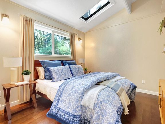 The home boasts granite countertops and a gas range in the kitchen, complemented by beautiful tile floors throughout. Skylights fill the space with natural light, and every room offers picturesque views of the redwoods. Enjoy outdoor living on the expansive back deck and spacious yard, ideal for relaxation and entertaining.