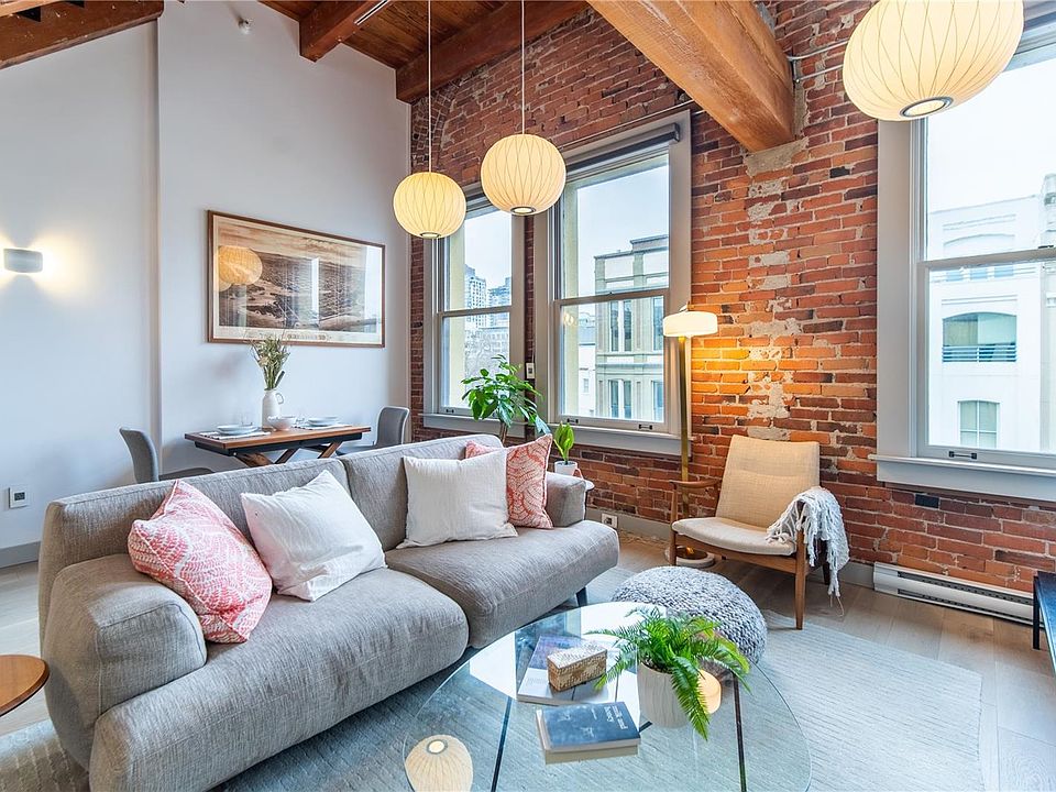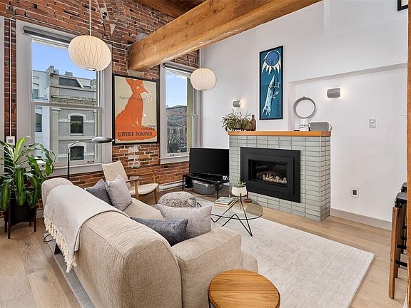 EXCEPTIONAL OFFERING! Experience urban living at The Vogue, a premier steel & concrete heritage conversion in Old Town Victoria. Luxury Heritage Loft featuring 21' ceilings, exposed old-growth beams, brick feature wall & floor-to-ceiling windows w Hunter Douglas remote sheers & blackouts ($7,500 value). Gourmet kitchen w custom cabinetry, stone counter, glass subway tile backsplash & high-end Euro appliances—Bosch D/W ($2,500), Blomberg gas stove ($4,000), Blomberg fridge ($3,000), premium sink & fixtures ($2,000). The open living space is anchored by a new Valor gas FP (2025, $7,500 value) w/ custom tile. Custom lighting ($5K), custom bath cabinetry ($8K), built-in desk ($2,500), in-suite laundry & radiant flrs throughout. Spacious loft w 11' ceilings fits king bed + furniture, w ensuite -convert back to shower. 17' balcony w irrigation. 1 secure parking + storage unit. Steps to shops, cafés, dining & transit. Over $77K in upgrades! Own a luxury loft in a prime heritage conversion!