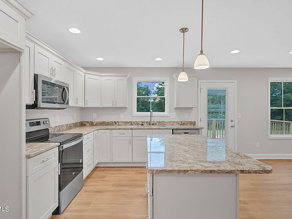 The heart of the home, the kitchen, is a chef's delight, boasting light gray cabinets, granite countertops, stainless steel appliances, an island, and a convenient pantry.