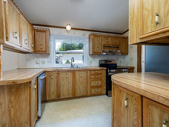 Discover pride of ownership in this immaculate 3-bedroom, 2-bathroom manufactured home situated on a peaceful corner lot within a quiet cul-de-sac in Pioneer Village 45+ community. The open and airy floor plan boasts vaulted ceilings, creating a spacious ambiance that flows seamlessly into the large kitchen. Here, you’ll find abundant counter space, ample cabinet storage, New stainless steel appliances, and durable vinyl flooring. The adjacent laundry room, complete with a washer and dryer, offers added convenience with extra cabinet storage and a clothes-hanging station. The expansive primary bedroom provides generous closet space and features an en-suite bathroom equipped with dual vanities and an oversized walk-in shower. Two additional bright and welcoming bedrooms complete this cozy living space. Step outside to the covered back patio, an ideal spot to unwind and enjoy the meticulously landscaped grounds, featuring mature greenery and a paver stone walkway. This property includes ownership of the lot, eliminating the need for additional lot rent! Conveniently located near local grocery stores, restaurants, and just a short drive to the I-70 corridor for easy commuting, this lovely home is clean, well-maintained, and move-in ready!