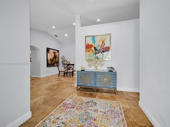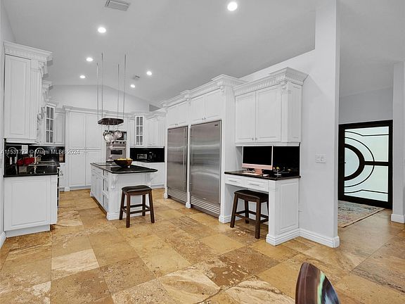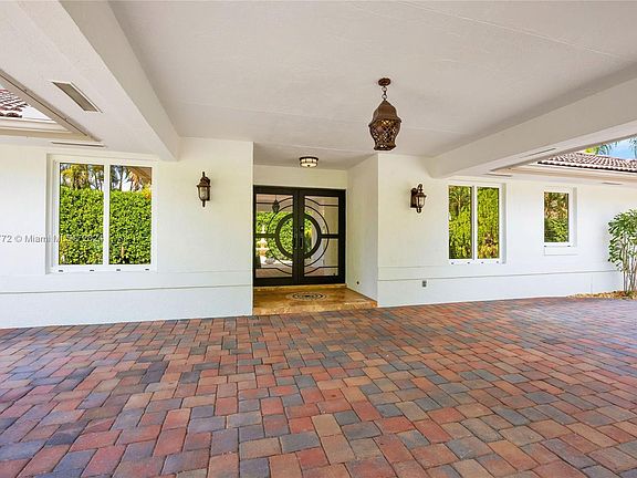 Impressive, South Miami estate home w/high volume ceilings and spacious social areas. You will delight in the space, privacy and luxury you desire. Open chef’s kitchen w/side by side SubZero refrigerator/freezer, JenAir wall ovens and dishwasher, and a new Bosch induction stove top. Two grand primary suites anchor each side of this split floor plan. All BRs have ensuite baths. Porte Cochere, electronic security gate, circular drive, 2 car garage (with enclosed storage space), waterfall pool with large terrace areas, mature landscaping and privacy hedges, shaded play area, private courtyard, tranquil butterfly garden. Custom impact glass entry door, open foyer, combined kitchen/dining area with adjacent sitting area, family room w/direct access to pool. Plus laundry and office/play room.