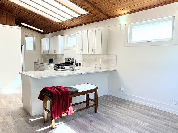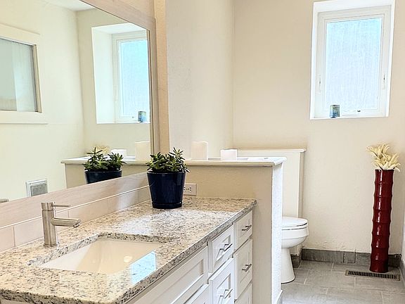 - Two bedrooms and a bathroom with a bathtub, new vanity, and new toilet.