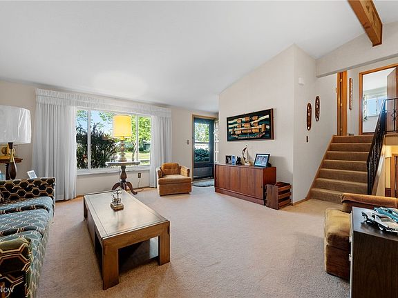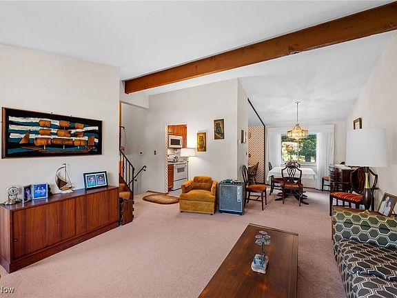 Welcome home to this wonderfully maintained home in Bedford Hts. Open floor plan on main level ~ living room with vaulted beamed ceiling and large picture window for natural light. Formal dining room has a vaulted ceiling and opens to the eat in kitchen which has tiled backsplash, all appliances to remain and door leading to the rear yard. There are three good sized bedrooms on the second floor all which have carpeting and window treatments. The full bath is spacious and has newer LVT flooring. The lower level is not to be missed! There is a 22x12 family room that offers additional living space and a half bath that could be converted to a second full bath. The laundry room is light filled and the washer/dryer will remain. There is a door which leads to the oversized two car garage which has additional room for storage. There is a gas line for the grill in the rear yard and front lamp post. Wonderful rear yard which is wooded, rear entrance garage and access to the home. Close proximity to shopping, schools, Bedford Hts Rec Center and highways.